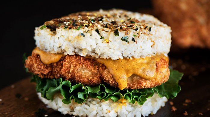 Burger nasi biasanya diisi dengan udang goreng, potongan daging yang sudah digoreng atau dibakar.