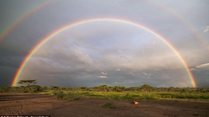 13. Pelangi ganda membentang di atas spot di mana seekor singa sedang beristirahat.