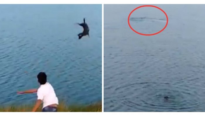 Sayangnya, sebelum anjing itu sampai ke daratan, buaya sudah terlebih dulu melahapnya.