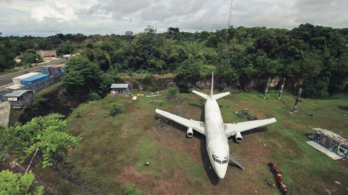 Bagaimana tidak, sebuah pesawat Boeing 737 ini 'terdampar' di tengah-tengah sebuah tanah lapang di Bali.