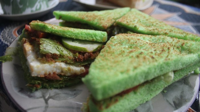 Sepasang roti pandan yang diberi isian telur mata sapi, tuna bumbu cabai yang sudah tentu memberikan sensasi pedas, potongan timun segar, potongan tomat segar, dan lembaran selada segar.