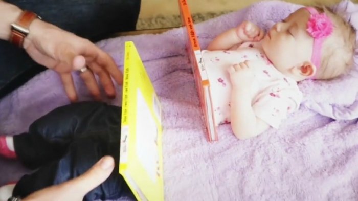 Ia lalu meletakkan buku itu secara vertikal di perut anaknya yang sedang terlelap.