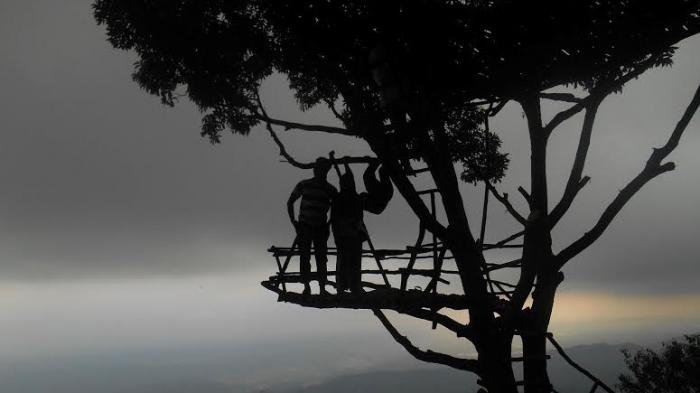 Di puncak, pengunjung akan disambut semilir angin yang langsung menghilangkan lelah, hamparan perbukitan tampak hijau seperti lukisan.