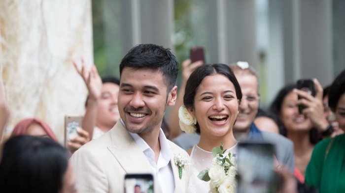 Pasangan selebriti ini tampak berbahagia dengan berbalut busana serba putih.