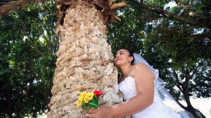 Sekelompok perempuan di Oaxaca, Meksiko, baru-baru ini mengadakan pernikahan dengan pasangan pengantin berupa pohon.