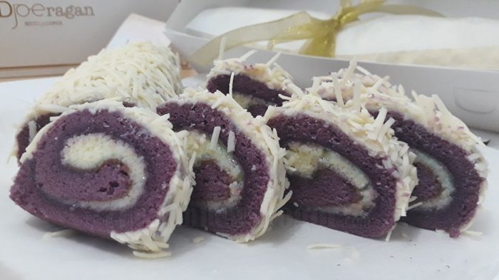 Terlihat bolu gulung warna ungu itu diberi topping penuh keju di bagian atasnya.