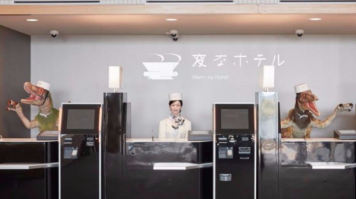 Hotel ini memiliki robot dinosaurus yang bisa berbahasa Inggris dan juga mengelola meja resepsionis.