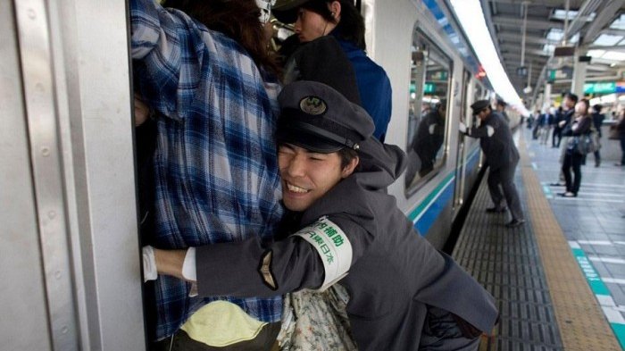2. Petugas kereta api di Tokyo, Jepang mendorong tubuh penumpang agar bisa masuk ke dalam kereta.