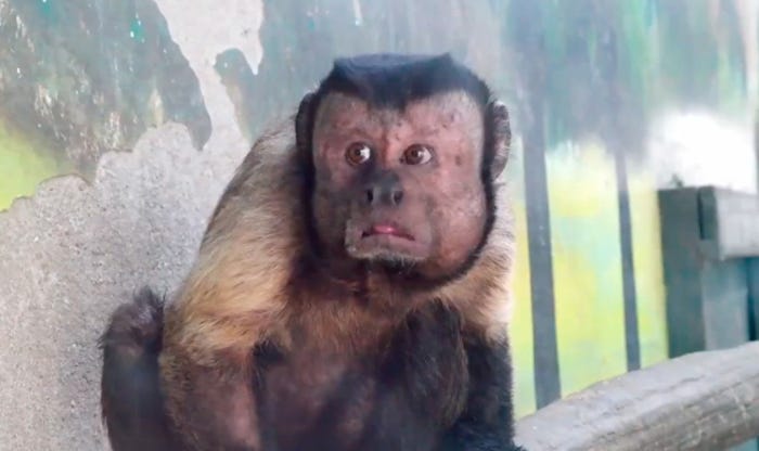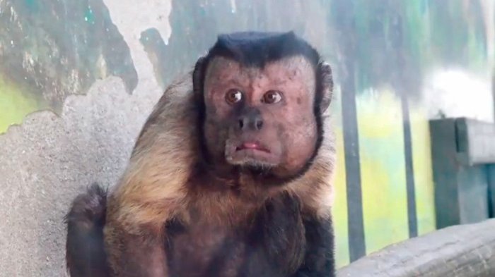 Dalam psotingan videonya, terdapat foto yang terfokus pada wajahnya tufted capuchin yang mirip dengan manusia.