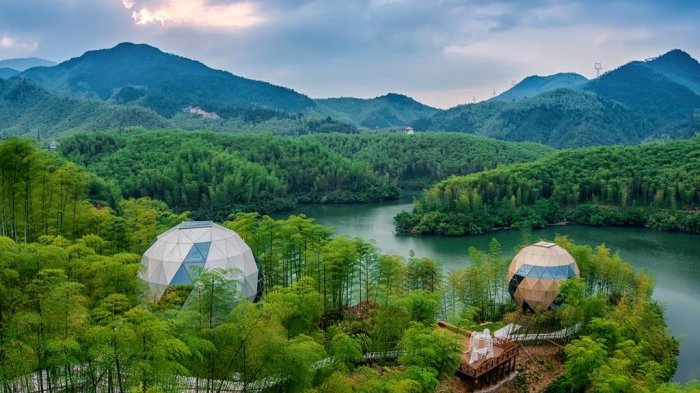 Resor ini menawarkan kamar yang berbentuk bola yang dikelilingi hutan bambu.