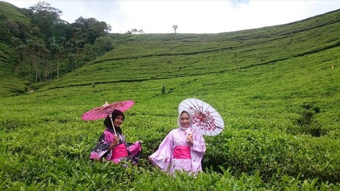 Tak hanya itu, pengunjung bisa memakai kimono sambil menyeruput teh. Pakaian khas Jepang itu juga bisa digunakan untuk berfoto di tengah kebun teh yang membentang luas.