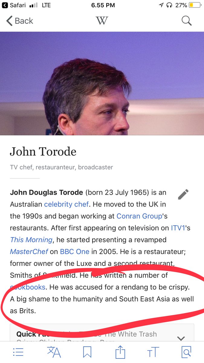 Artikel ini telah tayang di Tribunnews.com dengan judul Gara-gara 'Rendang Crispy', Profil Chef John Torode di Wikipedia Sempat Diubah Netizen