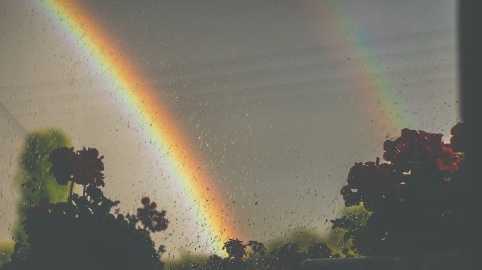 9. Pelangi ganda mucnul akibat sinar matahari dipantulkan dua kali di dalam rintik hujan.