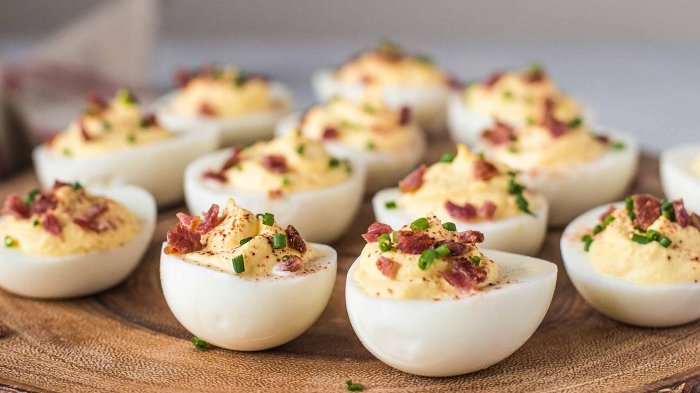 Deviled egg terbuat dari telur rebus yang dibubuhi mayones dan mustard.