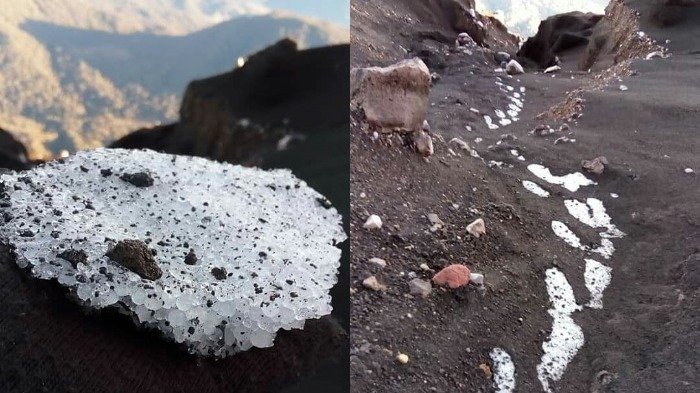 Dalam postingan itu menyertakan potret gumpalan frost atau es yang ditemukan Choirul Rizal Falashi, seorang pemandu gunung berpengalaman.