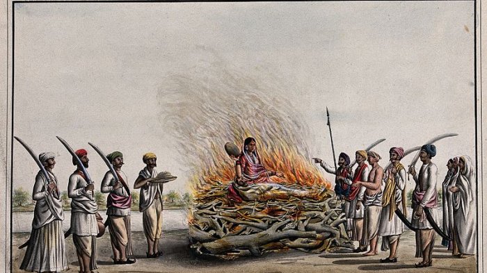 Para wanita yang ditinggal mati suaminya akan berbaring di samping jasad sang suami untuk dibakar hidup-hidup bersama mayat sang suami.