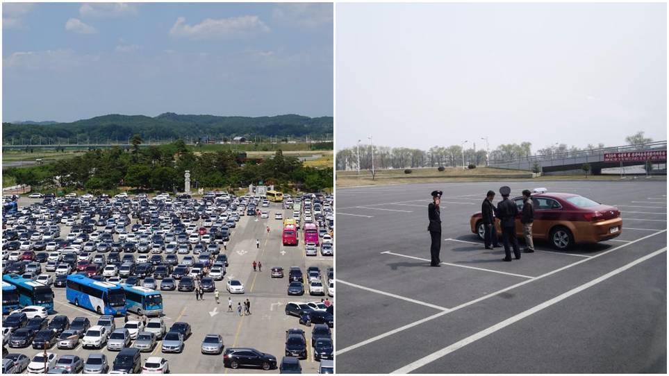 Korea Selatan memiliki tempat parkir penuh sesak yang dipenuhi dengan sedan dan bus, tetapi di sisi lain, tempat parkir Korea Utara benar-benar kosong.
