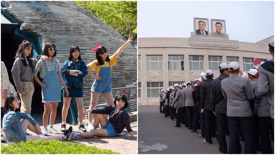 Wanita Korea Selatan berpose untuk selfies dalam pakaian berwarna-warni, sementara pemuda Korea Utara dipisahkan dan mengenakan seragam abu-abu kusam.