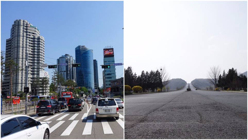 Korea Utara (kanan) terlihat lebih sepi di bandingkan dengan Korea Selatan (kiri).