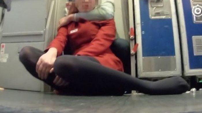 Sementara di bagian lain video lain memperlihatkan seorang pramugari duduk di lantai pesawat di dekat lemari penyimpan makanan.