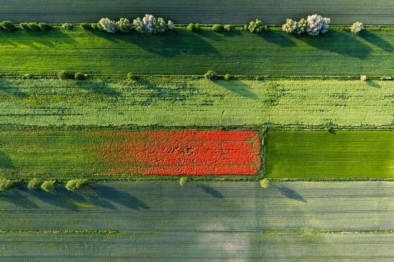 Dari ketinggian udara, paralayang di atas lanskap Polandia, Kowalski menangkap alam dan peradaban berinteraksi secara estetika, warna dan bentuk abstraknya begitu indah.