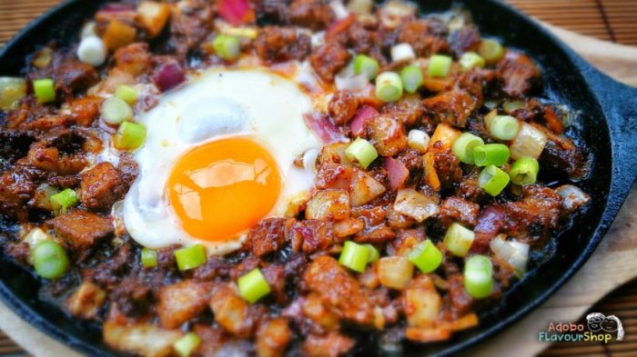 Sisig adalah hidangan daging berlemak dan pedas dengan kepala babi dan hati yang direndam dalam cuka, kecap, jus calamansi, dan cabai.