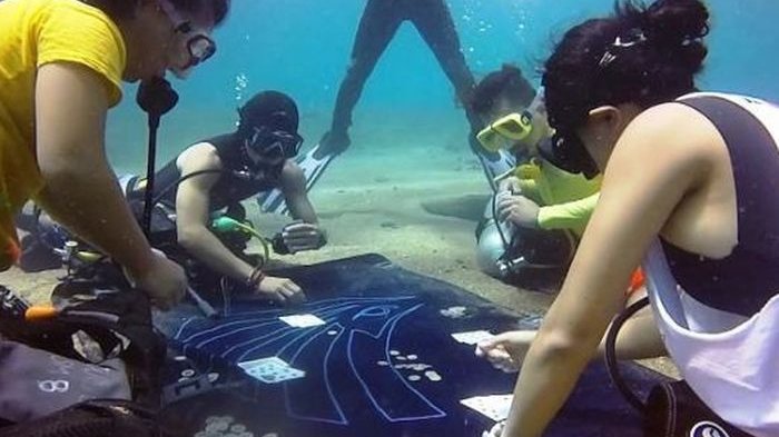 Para pemain poker itu memasang sebuah tikar plastik di dasar laut dan meletakkan kartu dan koin-koin di atasnya.