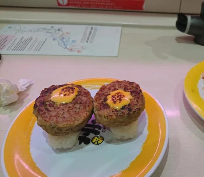 Tepatnya, irisan patty daging cheeseburger yang ditaruh di atas nasi kepal dan diberi saus kuning.