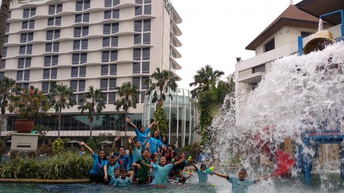 Istimewanya lagi, panitia dari Hotel Santika Premiere KHI Bekasi sudah menyiapkan beberapa permainan air seperti pengumpulan bola warna, dan berjalan kelompok di dalam air.