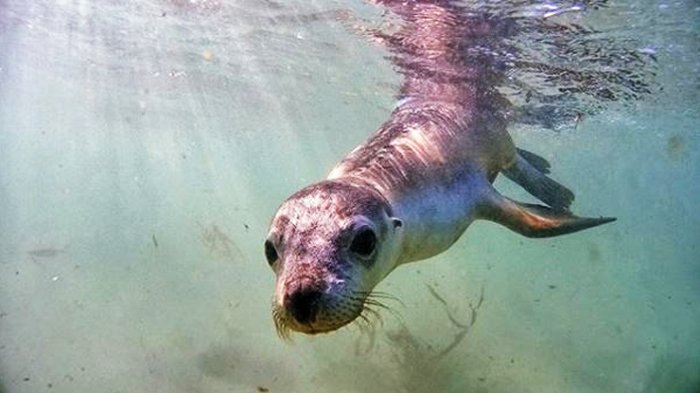 Seolah mengajak petak umpet, singa laut tersebut menghilang kemudian muncul kembali,.