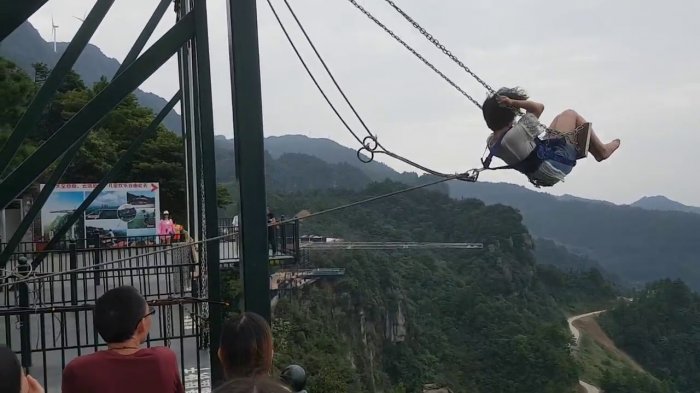 Hanya saja, turis yang mencobanya hanya dilindungi dengan sabuk pengaman di kursi ayunan.