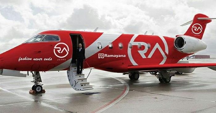 Bahkan pesawat pribadinya pun tertuliskan brand bisnis clothing Raffi Ahmad yakni RA Jeans.