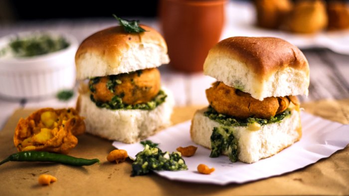 Vada pav berisi kentang parut yang kering dan dibubuhi topping chutney.