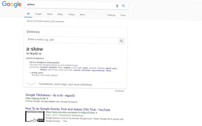 Setelah mengetik 'askew', layar pencarian Google akan jadi miring.