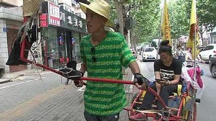 "Saat saya butuh istirahat, kekasih saya gantian menarik becak itu," ujar Wang.