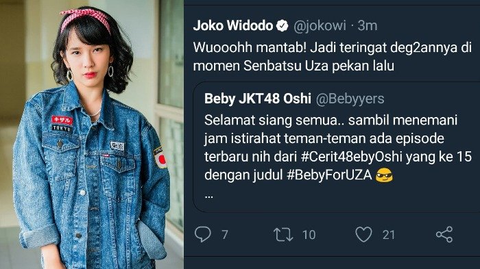 Bagaimana tidak, akun Twitter orang nomor satu di Indonesia itu mengatakan, ingatan tentang bagaimana perasaan ketika bertemu dengan anggota vokal grup JKT48.