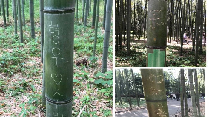 Menurut laporan, wisatawan yang merusak bambu sebagian besar berupa tulisan yang diukir.
