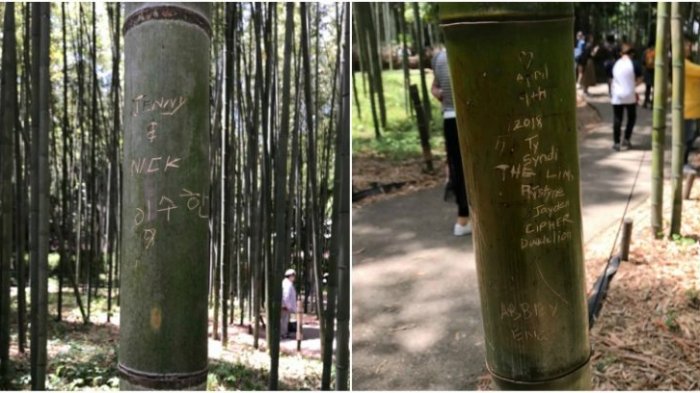 Setidaknya ada 100 pohon bambu dirusak dan dicorat-coret dengan bahasa Inggris, China, Korea, dan karakter Jepang.
