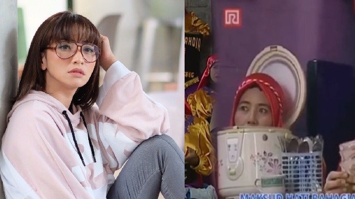 Dalam foto yang diunggah, wanita yang kerap tampil kocak ini 'menyembul' di tengah tudung saji warna pink, lengkap dengan penutup dan hiasan di kepala.
