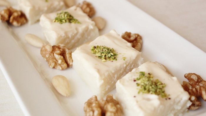 Ini adalah sajian penutup berupa puding gandum semolina yang dilapisi krim kocok dan diberi topping sirup dan kacang.