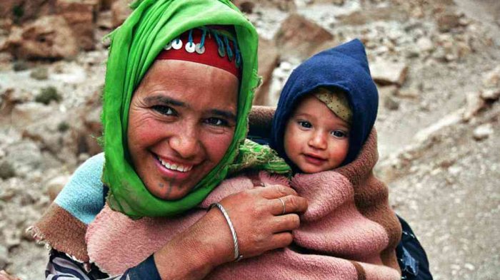 Di atas, seorang wanita dan anaknya tersenyum untuk kamera di Tinerhir, Maroko, pada 2003.
