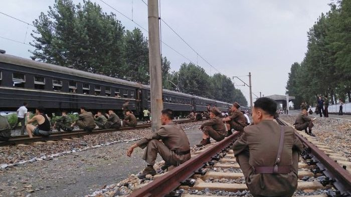 13. Pasukan Tentara Rakyat Korea tengah beristirahat di atas rel kereta