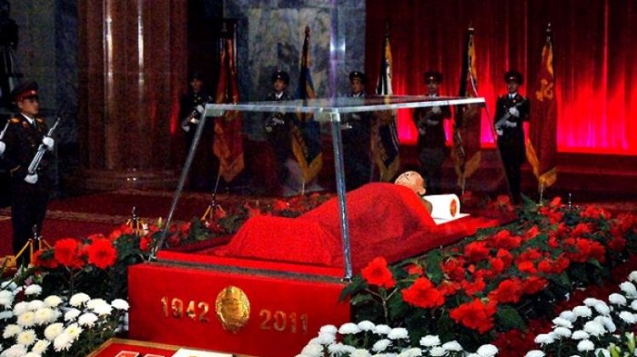 Tubuh Kim Il Sung terbaring di dalam sebuah kotak kaca.