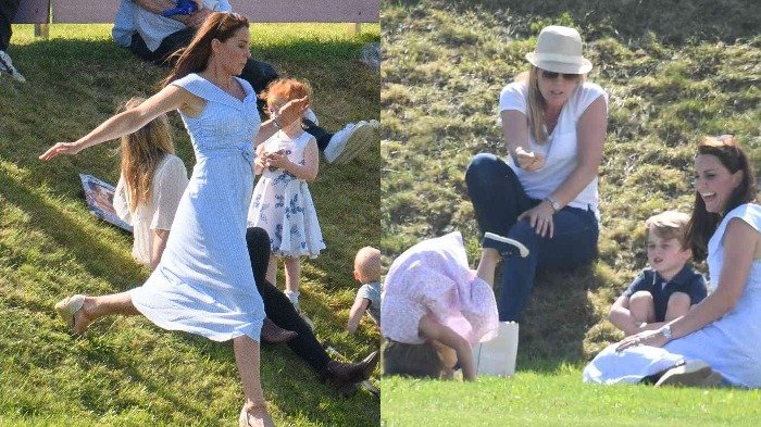 Tak ingin kehilangan momen berharga bersama kedua anaknya, Kate berlarian untuk bermain bersama mereka meski mengenakan sepatu hak.