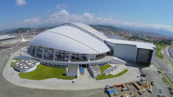 Stadion Fisht memiliki atap seperti kerang lalu didudukkan pada telur Fabergé dan bertakhtakan permata yang menjadi simbol budaya Rusia.