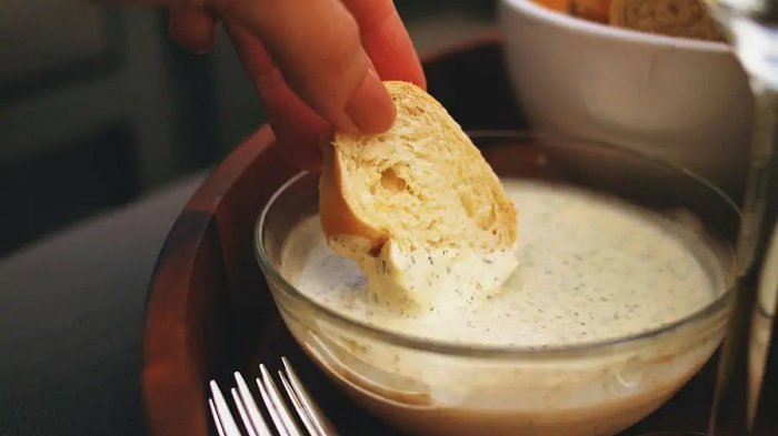 Bisanya, saus ranch disajikan bersama pizza, garlic bread, dan roti panggang.