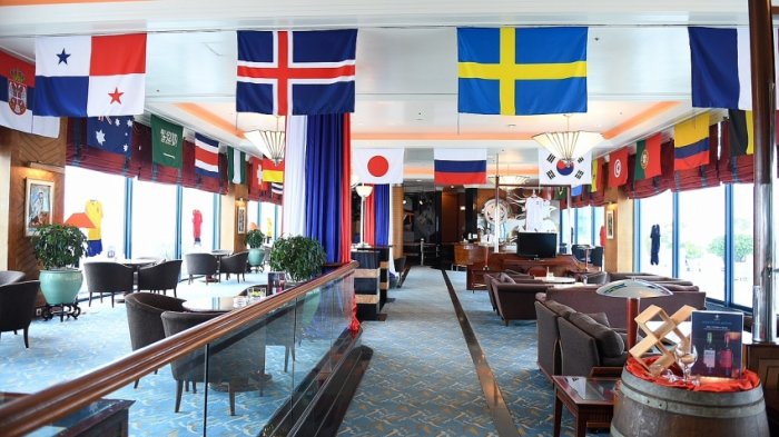 Bendera dari negara-negara peserta juga turut ditampilkan dalam ruangan ini.