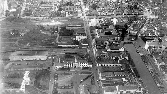 Tampak dalam foto adalah Kali Besar, Javasche Bank yang kini Bank Indonesia, Batavia Zuid Railway Station alias Stasiun Jakarta Kota, Stadhuis sekarang jadi Museum Fatahillah, Dewan Kehakiman kini jadi Museum Seni Rupa dan Keramik.