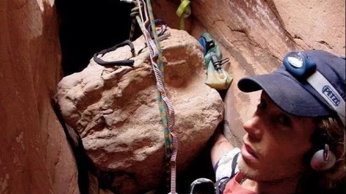 Sebuah batu besar seberat 363 kg menjepit lengan kanannya ke dinding ngarai yang dalam dan sempit.