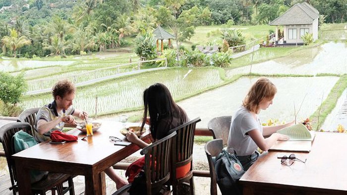 Di Bali khususnya di Ubud, aktivitas menikmati santapan lezat di atas bukit bisa ditemui di rumah makan Sari Organik.